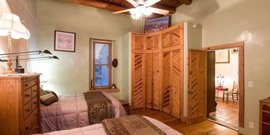 The Colorado Room, located in the Rectory, sleeps four with 2 queen beds. This room has its own bathroom (including a shower but no bathtub), sitting room, and access to the Spanish courtyard, outdoor kitchen/patio, and all outdoor areas that the Church compound offers.